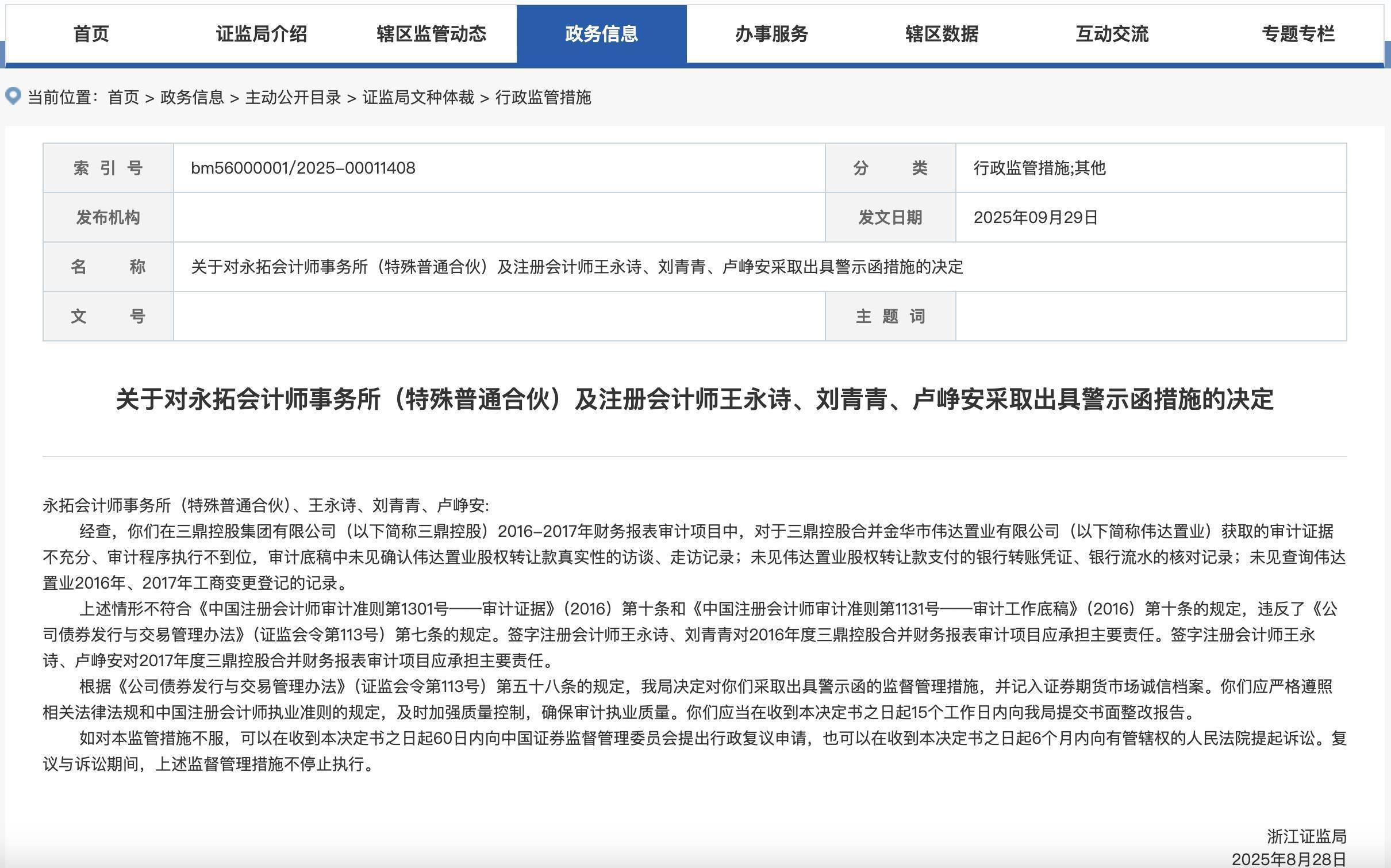 同时,浙江证监局还指出,永拓会计师事务所及注册会计师王永诗、刘青青、卢峥安在三鼎控股2016-2017年财务报表审计项目中,对于三鼎控股合并金华市伟达置业有限公司(以下简称伟达置业)获取的审计证据不充分、审计程序执行不到位,审计底稿中未见确认伟达置业股权转让款真实性的访谈、走访记录;未见伟达置业股权转让款支付的银行转账凭证、银行流水的核对记录;未见查询伟达置业2016年、2017年工商变更登记的记录。