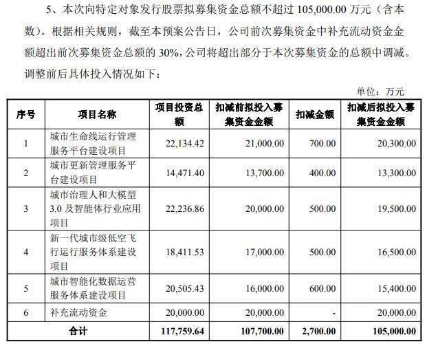 预案显示,本次向特定对象发行股票有五大目的:1、聚焦城市生命线工程领域,激发主营业务增长新动能;2、数字化赋能城市更新管理服务体系;3、建设新一代大模型应用平台,驱动城市治理智能化升级;4、响应国家发展低空经济战略部署,打造城市低空智能服务体系;5、紧抓人工智能产业发展机遇,建设数据要素全链条服务体系;6、进一步增强资金实力,为公司战略布局提供充分保障。